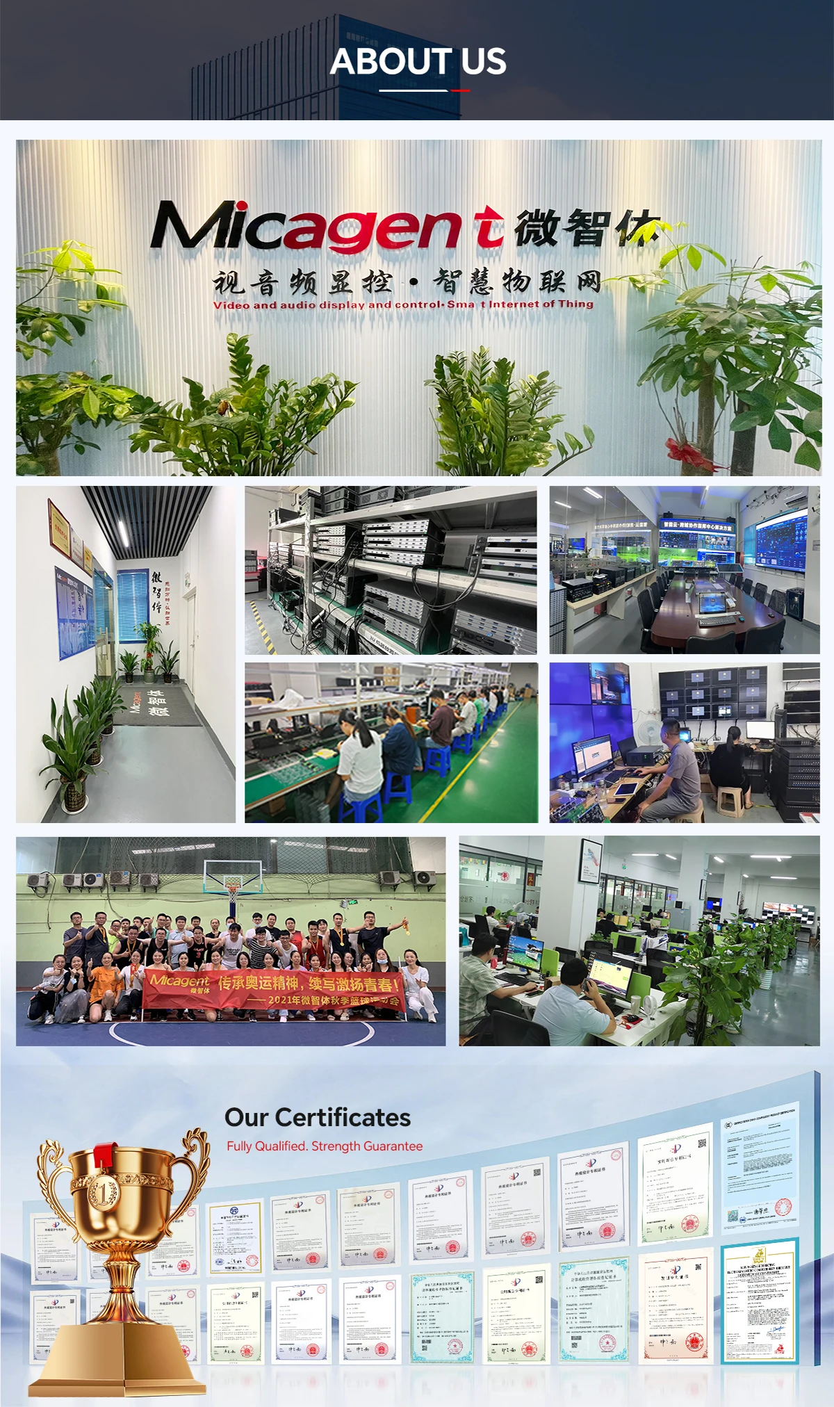 Shenzhen Micagent Technology Co., Ltd., established in 2015 in Shenzhen, China, is a professional provider of audio and video image processing, broadcast video equipment, and intelligent security products. Integrating R&D, production, sales, and service, we deliver innovative solutions across diverse industries. Our expert team is dedicated to product design, development, and quality control, supporting over 1,000 customers and more than 10,000 successful project implementations. Our products and services span smart cities, commercial displays, emergency command, security, conferences, game live streaming, education, healthcare, government services, public safety, and energy management. We adhere to a modern quality management system aligned with international standards and have obtained numerous national invention patents, software copyrights, CCC certification, CE certification, and more. These accolades demonstrate our commitment to excellence and innovation.